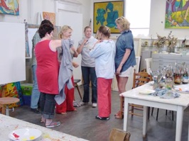 We schilderen achter een ezel op een doekje van 30 x 40 cm na eerst een schets aangebracht te hebben op het doek.