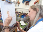 Met Tekenmaterialen en/of Verf op Papier staan/zittend werken we achter schilderezels in het goed verlichte en goed geoutilleerd