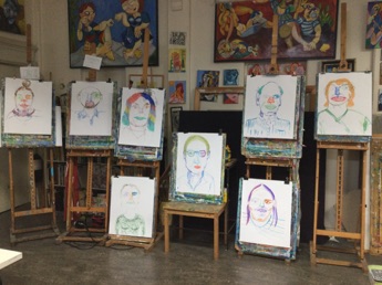 Alle deelnemers werken aan ALLE PORTRETTEN, behalve die van zich zelf. De modellen blijven staan en de "kunstenaars' wisselen van plaats. De opdrachten worden met verschillende materialen en technieken uitgevoerd.