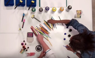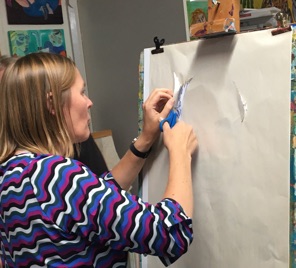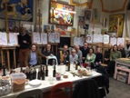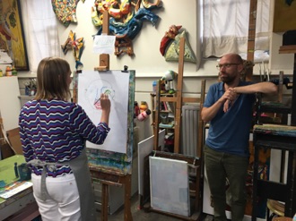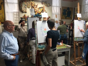 De deelnemers werken op witte A-3 vellen achter een schildersezel met verschillende materialen.